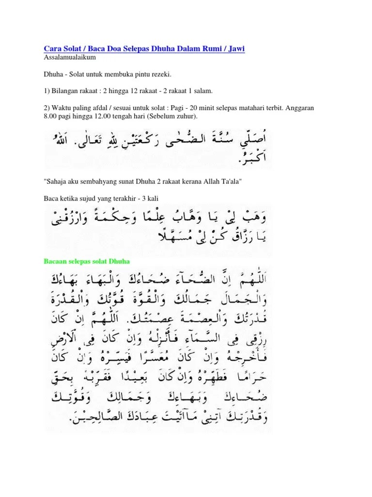 "sahaja aku sembahyang sunat dhuha 2 rakaat tunai kerana allah ta'ala." . Solat dhuha boleh dilakukan dengan dua rakaat paling sedikit, kemudian seterusnya empat, enam, lapan . Cara bacaan rumi doa selepas witir: Solat sunat witir dengan 2 rakaat, kemudian disambung dengan 1 rakaat. Solat sunat dhuha dua rakaat:
